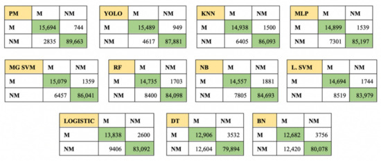 The performance analysis of the classification of skin lesions using five-fold cross-validation is represented in Table 11, where performance metrics such as Accuracy (Acc), Sensitivity (Sen), Specificity (Spec), Precision (Prec), Recall (Rec), F1, MCC, AUC, and Standard deviation (SD) are calculated for different methods. A sum of 108,936 dermoscopic images are used to train and validate each method, out of which 103,524 images are from the training set (after data augmentation) and 5412 are from the validation set. The cross-validation fold is set to be 5, thereby avoiding any overfitting of data. In total, 21,787 dermoscopic images are randomly assigned to each of the four sample datasets. The performance of each model is based on the training on the first four sample datasets and validating it against the last sample dataset (of 21,787 images). The average performance of all these models is also encapsulated in Table 11 to show its overall performance. Table 11 concludes that the proposed method outperforms when trained and after five-fold cross-validation against the state-of-the-art models, such as KNN, YOLO, SVM, etc. A confusion matrix for each of the classifier is pictorially represented in Figure 9, which shows the value of the true positive, true negative, false positive, and false negative.
