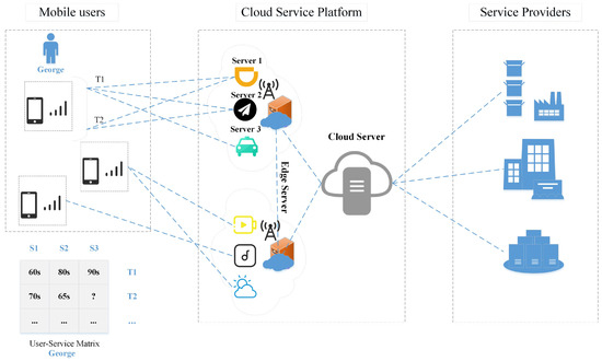 A real taxi service invocation scenario is shown in Figure 1. The left part is the user, the middle is the cloud server and its services, and the right is the major service providers. The table at the bottom shows the Qos generated by user George invoking the service. The server provides corresponding services according to user requests. As an example for George, the user in Figure 1, suppose that George, a mobile user, wants to invoke a car rental service provided by a service provider uploaded to a cloud server. Thus, the edge server near George provides three candidate services Server 1, Server 2, and Server 3 to George’s mobile device phone. For George, who wants to choose a rental car service, it is difficult to choose between the three rental car services. QoS is an important metric to differentiate the quality of service between functionally equivalent MEC services. In a real invocation scenario, due to a large number of candidate services, in the past, users usually invoked a limited number of MEC services and assigned the corresponding QoS values (car rental services are selected based on QoS an attribute response time). The edge server records that previously, George called services Server1, Server 2, and Server 3 at T1, but called Server1 and Server 2 at T2, resulting in the QoS value of Server 3 being unavailable at T2. Usually, not every user invokes every service provided by the server at every moment. In the case of sparse QoS data, it is difficult to perform relevant operations on MEC mobile services (service recommendation and service composition) [10]. This paper focuses on how to predict missing QoS data values, because QoS record prediction of missing values is a critical step in operations related to mobile services.