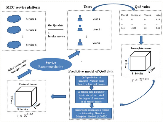 In the real MEC mobile service application environment, the QoS data and the value declared by the provider will be slightly different. Usually, due to time and network constraints, only limited QoS data are available to each user calling the service. It is difficult to provide users with high-quality services and accurate recommendations using these missing QoS data. Therefore, we propose a TLTC-based QoS prediction framework for the low-rank characteristics of QoS data to predict the lost values of QoS data. Figure 3 shows the QoS data prediction framework model proposed in this paper. First, the user obtains sparse QoS data from the server. After data processing, a tensor data model is constructed. After the training and optimization of the TLTC model, the complete recovered QoS data are obtained. Then, the predicted QoS values are sorted, and the service that meets the user’s needs is recommended to the user.