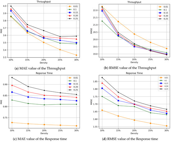 Figure 5a,b presents the experimental results of the MAE and RMSE of the Throughput. Figure 5c,d presents the experimental results of MAE and RMSE of Response time. First, for the QoS dataset of Throughput attributes, the truncation rate parameters 0.01, 0.1, 0.15, 0.2, 0.25 were used for testing. The number of iterations was chosen to be 20. The experiment shows that when the integer truncation value of the tensor is 0.01, MAE decreases more stably than other values when the density of the tensor is between 10% and 30%. It shows that the difference value is handled well. Moreover, the obtained MAE value is relatively low, indicating that the prediction effect is better when the truncation rate parameter value is 0.01. For the value of RMSE, when the truncation rate parameter is 0.01, although the value is not ideal, the convergence rate is faster than other values. In overall evaluation, the prediction effect is the best when the value of the truncation rate parameter is 0.01. Although the MAE value of the Throughput is relatively low when the value of the truncation rate parameter is 0.1, its RMSE value is relatively high. We should expect MAE values to be much smaller than RMSE values.