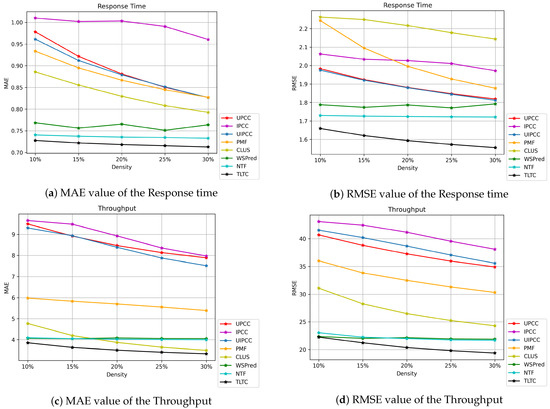The experiments show that the prediction accuracy is positively correlated with the tensor density of QoS data. It can be seen from Figure 6 that the density of the training tensor is changed from 10% to 30%, and the step size increases by 5%, the prediction accuracy of method also gradually changes. The prediction accuracy of the TLTC method increases with the increase of training density. This is because the greater the density of QoS data which provides more useful information, the better the prediction effect of the method.