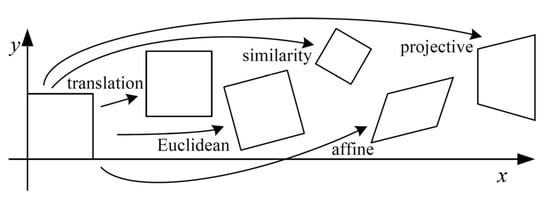 Algorithms for aligning images and stitching them into seamless photo-mosaics are among the oldest and most widely used in computer vision. The alignment of images requires establishing mathematical relationships that map pixel coordinates from the unaligned images to their aligned versions. Five parametric 2D planar transformations have been defined [] (see Figure 1). Each one of these transformations can be described by a transformation matrix , with being a vector of parameters. Pure translation can be written as or , where is the vector of coordinates of the untransformed image pixel and denotes the coordinates of the same pixel in the transformed image, is the (2 × 2) identity matrix, and is the translation vector, containing two parameters (respectively, the translation along the x-axis and the translation along the y-axis). The Euclidean transformation is written as , where is the 2D rotation matrix. Thus, Euclidean transformation depends on three parameters: , , and an angle θ (for the rotation matrix). Euclidean distances are preserved. The similarity transformation, also known as scaled rotation, preserves angles between lines. It is expressed as , where is the scale parameter that brings the parameter counter to four. It must be noted that is a scalar and the scaling operation is intended to be isotropic. The affine transform is written as , where is an arbitrary 2 × 3 matrix with six parameters. Parallel lines remain parallel under affine transformations. Projective transformation, also known as perspective or homography, is expressed as , where is an arbitrary 3 × 3 matrix: