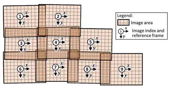 This work developed a direct method capable of simultaneously aligning multiple images. The method is suitable to be used when the rough position of the camera (the shooting pose of each image) is known. That is the case for robotically acquired images, where the camera position is obtained from the robot’s positional feedback. Given a set of images, knowledge of camera shooting poses allows skipping the search for the adjacency relationships among the set. Knowing the scale factor makes it possible to convert the pixel index coordinates to real-world coordinates and identify the overlap between the images. The scale factor can easily be calculated by measuring the size of a known object or the known distance between two points in an image in terms of the number of pixels and considering the actual length it represents. Therefore, the algorithm herein is specifically targeted to perform a fine alignment of all images in the set. It is referred to as the Fine Pixel-based Alignment Method (FiPAM). It must be noted that FiPAM is currently suitable for aligning multiple mosaic images of a sample surface that curves only in one direction. Although the constraint of single direction curvature is a significant limitation, it does not impede using FiPAM for mosaic images of any surface belonging to the large family of cylindrical surfaces intended as “generalised cylindrical surfaces” []. Under that condition, all collected images can be transposed to a planar domain. Indeed, any cylindrical surface can be represented in the plane by “unrolling” it on a flat surface. An additional assumption is that the part surface captured within the camera field of view is sufficiently close to a flat plane. In other words, the ratio between the local surface curvature and the camera field of view must be small. Figure 2 illustrates a set of nine images used to explain the theoretical foundations of FiPAM.