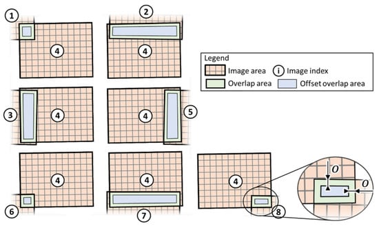 Illustration of all overlap areas between image #4 and neighbour images. The magnified region serves to clarify the relationship between the overlap areas and the offset overlap areas.