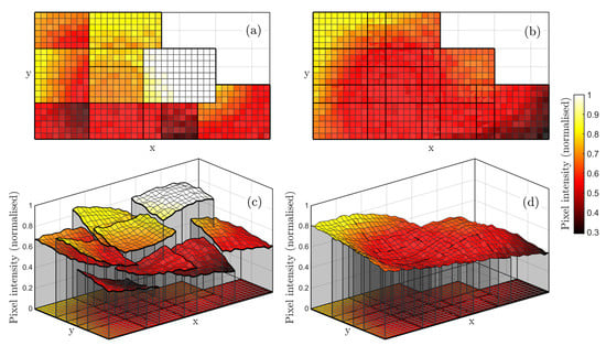 Aligning all images in a dataset is not sufficient to merge the images into a single composite image. Indeed, multiple aligned images may present significant differences in pixel intensities in overlapping areas. For RGB images, exposure differences are typically caused by ambient light changes during image capture. In active thermographic imaging, the same problem may be caused by the progressive increase of an object’s surface temperature when it is subject to multiple heat pulses. Image blending is usually accomplished through averaging the intensity of homologue/overlapping pixels or by using more sophisticated methods, such as “Laplacian pyramid blending” [] and “Gradient-domain blending” []. Although these blending methods work well and have been implemented in many variants for consumer imaging (e.g., for panoramic image stitching), they cannot directly be used to blend images originating from NDT inspections. Indeed, in NDT images, it is necessary to retain the robustness of quantitative information (e.g., to perform pixel intensity comparisons) and avoid introducing any image processing artefacts. A typical challenge lies in removing low-frequency exposure variations while retaining sharp intensity gradients that may indicate the presence of small defects. In other words, it is necessary to prevent blurring. In this work, image blending has been solved through a method that preserves the valuable NDT information in each image. All pixel intensities in an image are offset by a unique value to maintain gradients unaltered. To explain this approach, Figure 4a,b provides an example of nine aligned images. The intensity discontinuity between any two overlapping images has been purposely emphasised. These example images do not contain high contrast features, which are typical for NDT images taken of a not-defected sample.