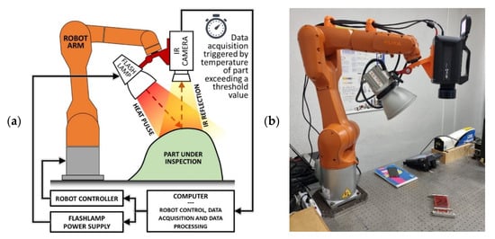 (a) Schematic representation of the robotic thermographic setup used in this work; (b) Photo of the actual laboratory setup.