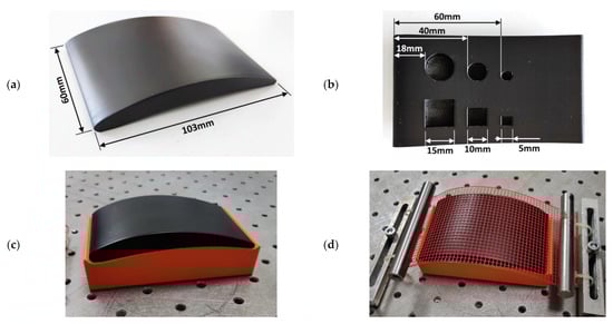 The sample was an epoxy specimen reproducing the curved geometry of a compressor blade. The specimen was produced by pouring a mix of liquid epoxy resin and a hardener into a mould. The resultant polymerised sample had one convex side, one concave side, and a varying thickness. The curvature of both surfaces is constrained to one direction. Six flat bottom holes (FBHs), three with square sections and three with round sections, were machined on the concave side of the sample as artificial defects. Thus, the FBHs are not visible from the convex side of the sample. Figure 6a,b illustrate the sample geometry, its main dimensions, and the position and size of the FBHs. The sample was coated with acrylic-based black matt paint to uniformise and enhance the surface emissivity, improving the effectiveness of PT inspection. The sample was placed on the optical table at a registered position within the working envelope of the robot arm, using a fixed custom supporting base. The specimen was inspected from the convex side. Figure 6c shows the sample ready for inspection. In order to validate the proposed alignment method, as will become clear in the following sections, the robotic thermographic inspection was also performed by wrapping the sample with a flexible plastic 3D printed grid (as shown in Figure 6d). The grid square pattern had a 3 mm pitch and wire width of 0.6 mm.