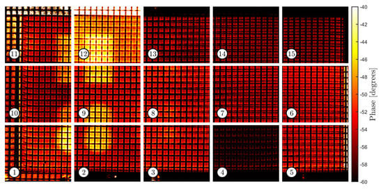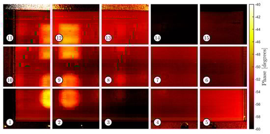 Figure 9 and Figure 10 show the sets of thermographic images acquired with the tool path presented in Section 4.3, using a camera focal distance of 550 mm. The camera acquired the evolution of the thermographic field for 10 s at each pose (starting from one second before the trigger of the flashlamp). DFT was used to evaluate the frequency content of the thermal response at 0.6 Hz. All images have the same size (192 × 224 pixels). They relate to the images captured from the sample with and without the grid. Thus, the same robotic tool path was repeated twice to ensure repeatability in the acquisition poses. It must be noted how the average pixel intensity varies from image to image within each set; for example, image #4 and image #12 respectively present significant lower and higher average intensity than the rest of the images in the first set, respectively. Furthermore, pixel intensity is not repeatable since differences are evident across the two sets. Any pair of corresponding images in the two sets present a visible difference in pixel intensity.