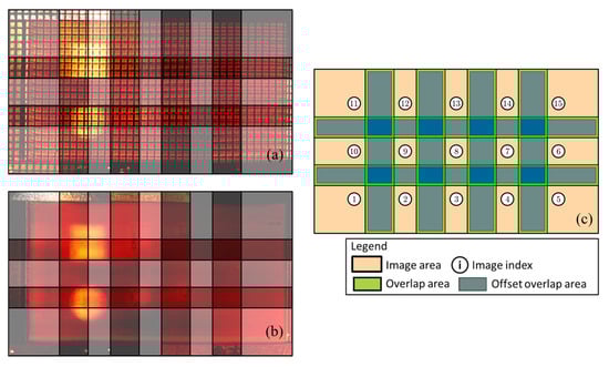 Figure 11 highlights the initial estimate of the overlaps in each set of images. The images were encoded with the camera shooting positions and scaled by the measured resolution value. The known pitch of the grid (3 mm) was used to estimate the resolution of the images, which was 150 μm/pixel (≅4444 pixels/cm2). Figure 11a,b relate to the set of images with and without the grid, respectively. There, the image pixels were plotted with 50% transparency to allow visualising the overlaps, which are more clearly illustrated in Figure 11c. Following the notation introduced in Section 3.3, the presented FiPAM method was employed using a value of 1 mm for the offset (o) between the image overlap areas and the shrunk areas. This equates to assuming that the maximum distance between a pair of corresponding pixels in neighbour images (the misalignment) does not exceed 1 mm, which is the case for the sets of images at hand.