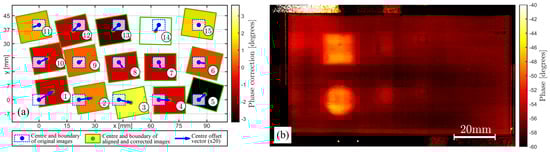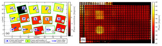 Figure 12 and Figure 13 illustrate the results obtained with FiPAM, using the similarity transformation for all images. The similarity transformation, which allows four DoFs (horizontal translation, vertical translation, rotation and scaling), proved sufficient to permit a fine alignment of all images in the given sets. In Figure 12a and Figure 13a, whereas the dotted blue line rectangles represent a fivefold scaled-down version of the original images, the rectangles with a green line perimeter represent a twofold scaled-down version of the aligned images, where the translation is magnified by a factor of 20 and the rotation transformation is maximised by a factor of 40. These magnifications were introduced to illustrate the computed alignment transformations for visualisation purposes. The infill colour given to each aligned image is linked to the computed pixel intensity correction through the indicated colour map. The resulting blended mosaic thermographic image (460 × 800 pixels) is given in Figure 12b and Figure 13b for the images with and without the grid, respectively.