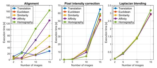 Although FiPAM execution times are machine-dependent, the patterns presented in Figure 14 provide a helpful guideline for understanding the general trends. As expected, the execution times for alignment, pixel intensity correction and Laplacian blending increase with the number of images. The alignment phase execution time also depends on the type of transformations used for the images in the set. They influence the size of the least-squares problem and the number of transformation parameters to find through the minimisation of the SSD function in Equation (3). Thus, for a given number of images to align, using the same type of transformation for all images, the execution time increases monotonically, moving from translation to Euclidean, similarity, affinity and homography transformations. Although all possible combinations are not assessed in this work, it is not difficult to imagine intermediate execution times for generic combinations, where not all the images get transformed by the same transformation type. As a rule of thumb, for a given number of images, the alignment execution time should never exceed the time relative to the case where all images get transformed through homography, since it corresponds to the biggest problem with the maximum number of parameters. Fluctuations in alignment execution times can be observed for patterns relative to translation and Euclidean transformations. They are thought to be caused by the limited DoFs allowed by these transformations, which can cause prolonged convergence times due to the difficulty of obtaining a good image alignment. The execution times of the pixel correction and Laplacian blending phases depend on the number of images. The minor differences associated with the used transformation type are thought to be caused by the different overlaps of the aligned images, which changes the number of pixel intensity differences to compute for the SSD function in Equation (4).