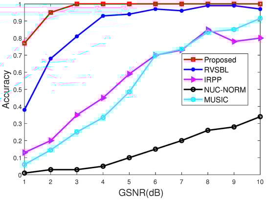 The comparison experiments are carried out in different parameters, mainly including characteristic exponent , GSNR and signal snapshots. We compare our method with the three latest methods, mainly including nuclear norm minimization (NUC-NORM) [17], iterative reweighted proximal projection (IRPP) [18], robust variational Bayesian inference (RVSBL) [31] and multiple signal classification (MUSIC). NUC-NORM and IRPP are proposed for MIMO DOA estimation and RVSBL is proposed to deal with impulsive noise via Bayesian learning. Meanwhile, two quantities, named accuracy and root mean square error (RMSE), are calculated with 200 Monte-Carlo experiments. An accurate estimation of DOA is defined as:
