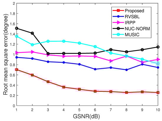In this subsection, we conduct the experiments with GSNR in a range from 1 dB to 10 dB. The characteristic exponent of noise is set as , and the snapshot of signals is set as 10. Simulation results are illustrated in Figure 1 and Figure 2.