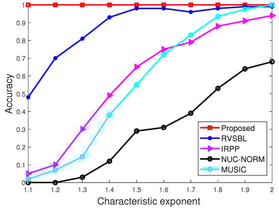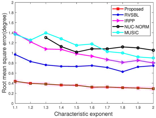 In this subsection, we conduct the experiments with characteristic exponents in a range from 1.1 to 2. GSNR remains unchanged at 5 dB. The snapshot of signals is set as 10. The results are demonstrated in Figure 3 and Figure 4.