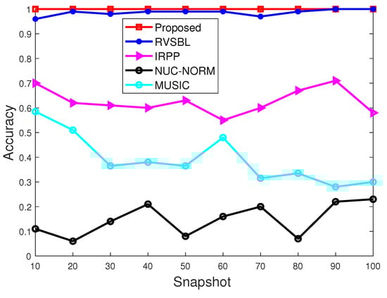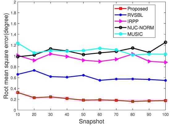 As shown in Figure 5 and Figure 6, it can be observed that only our method and RVSBL can keep high accuracies in all conditions because of their suppression of impulsive noise. In addition, our method can even keep a totally successful estimation in all experiments. By contrast, IRPP- and NUC-NORM-based methods show bad and non-stable accuracy in the simulations. Furthermore, our method shows the best performance on RMSE due to its operation for off-grid condition.