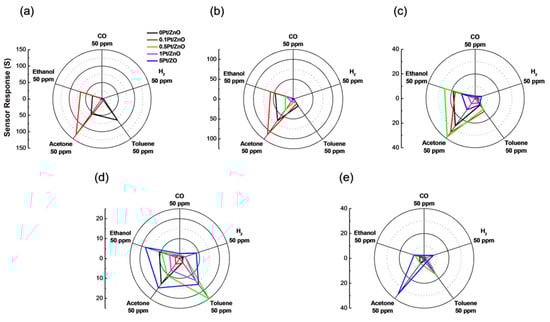- Suematsu, K.; Watanabe, K.; Tou, A.; Sun, Y.; Shimanoe, K. Ultraselective Toluene-Gas Sensor: Nanosized Gold Loaded on Zinc Oxide Nanoparticles. Anal. Chem. 2018, 90, 1959–1966. [Google Scholar] [CrossRef] [PubMed]
