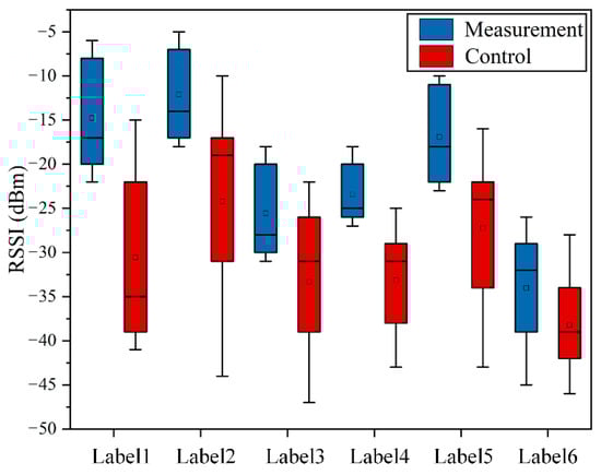 In order to confirm the discrimination of RSSI values received by the reader, a custom antenna is temporary placed one meter away from each group. The corresponding measurement results are shown in Figure 3.