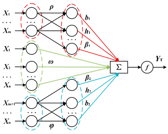 where and represent the degrees of two hidden layer neurons, respectively. βi and βj are the output weights of the i-th and j-th neurons. λi and λj are the output values. Whenever the degree of a neuron exceeds the highest threshold (CHth) or jumps below the lowest threshold (CLth), this original neuron is split into several new neurons or merged with other nearby neurons. For the weights between the input layer and the two parallel hidden layers, ρ and φ, the bias of hidden layers, b, and the output weights between hidden layers and the output layer, β, specific adjustment rules are set, as follows: