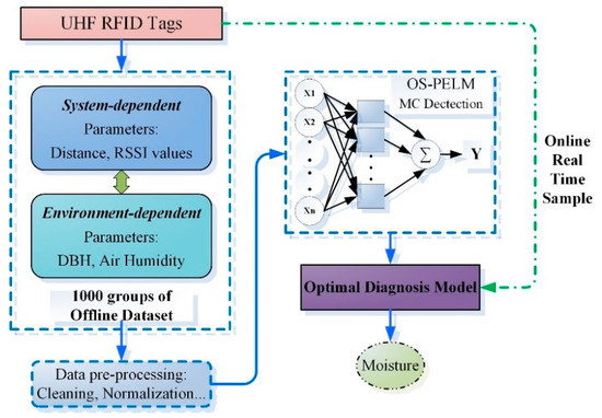 The establishment of the entire model is shown in Figure 7. The basic principle of the MC prediction model based on deep learning is to map the input features (RSSI, measuring distance, air humidity, and DBH) to the output-specific MC value. We aim to employ an appropriate intelligent model to find the optimal computational mechanism for the MC prediction scheme. Considering the time-varying characteristics of the receiving signal parameters and environmental conditions, we develop a novel online sequence learning algorithm, which can learn and update the model from the newly received data without tedious retraining. Only then can the diagnostic system meet the needs of real-time UHF RFID sensing.