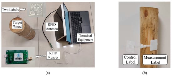 Figure 8a shows the equipment distribution of the laboratory test scenario. Two labels are attached to the reverse side of the wood sample and placed at the same height. The two practical installed control and measuring labels are shown in Figure 8b. The aim of the control tag is to obtain a raw RSSI value free of moisture and wood medium effects, which can be used as a benchmark to facilitate the classification of the experimental samples during measurement. The computing terminal is configured with 2.66 GHz CPU, 16 GB RAM and the Windows 10 system.