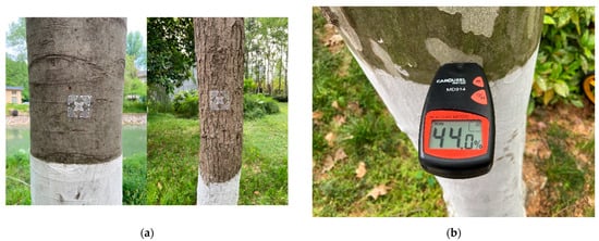 Measurements on standing trees. (a) shows the schematic diagram of sticking labels on the standing trees, and (b) shows the actual moisture content of trees calibrated with MD914.