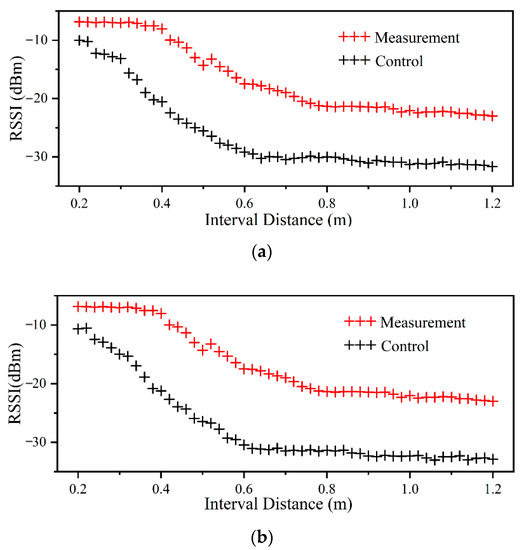 Laboratory RSSI values with samples containing different MC levels. (a) is a laboratory-prepared wood with a 35% MC level, and (b) is a laboratory-prepared wood with a 25% MC level.