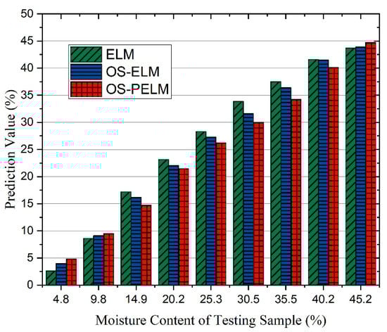 The prediction results of three methods were calculated and are displayed in Figure 11. For the experiments using nine different sample boxwoods with an MC range from 5% to 45%, the prediction performance of the OS-PELM means is significantly better than the outcomes of the ELM and OS-ELM algorithms. In addition, the average error between the diagnosis output and the ground truth is lower than 4.4%. Hence, the laboratory detecting system shows a high precision and adequate data stability.