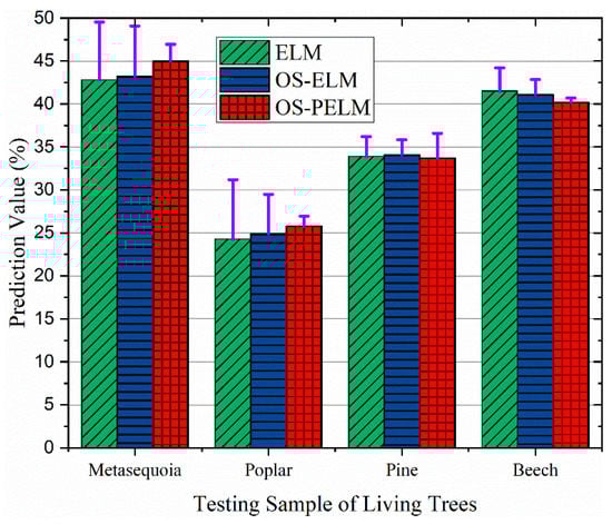 To verify the reliability of the proposed system for MC detection in living woods, the corresponding data from sample trees (metasequoia, poplar, pine, and beech) in the artificial forest station were collected for analysis, with MC levels of 45.9%, 26.1%, 34.7%, and 40.4%. The comparative experimental results are shown below in Figure 12. The system still shows good diagnostic performance for the online dynamic data, and the relative error bar indicates that the detection accuracy is higher than 97.1%. It is apparent that the OS-PELM can accurately identify the MC status for both coniferous and broadleaved woods, which proves that this diagnostic model has strong generalization ability and good robustness.