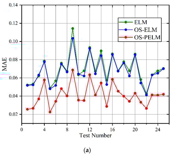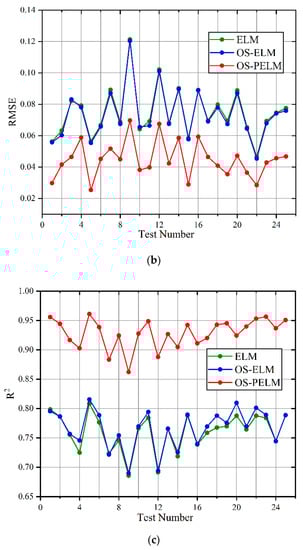 Then, we conducted evaluation dataset construction on the standing pine for 24 h. All of the relevant parameters were collected, and the three mechanisms operated 25 times each, as shown in Figure 13. For every test, the prediction accuracy of OS-PELM is higher than that of the other two algorithms. Moreover, the MAE and RMSE of the OS-PELM algorithm for MC prediction do not exceed 0.1, and the R2 coefficient is maintained above 0.9, which strongly proves the accuracy and reliability of the method.