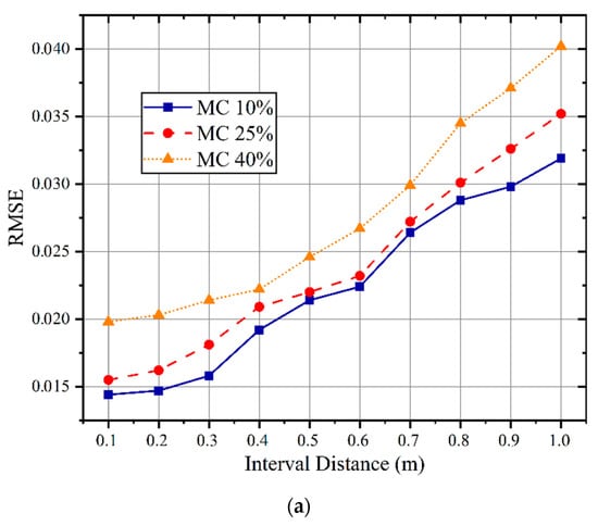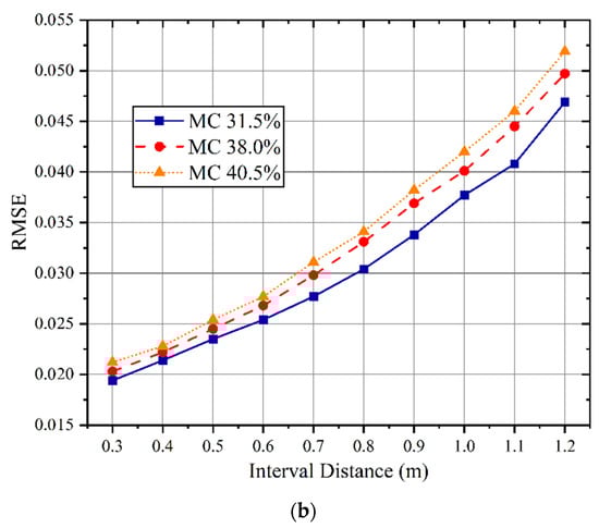 The corresponding results are shown in Figure 14a. As the distance between the antenna and trunk increases, the prediction accuracy decreases, especially when the distance exceeds 0.4 m. The main reason is that the proportion of RF signals that can be transmitted through the wood is reduced. When the interval distance is within 1 m range, the RMSE of the proposed OS-PELM prediction model is less than 0.04.
