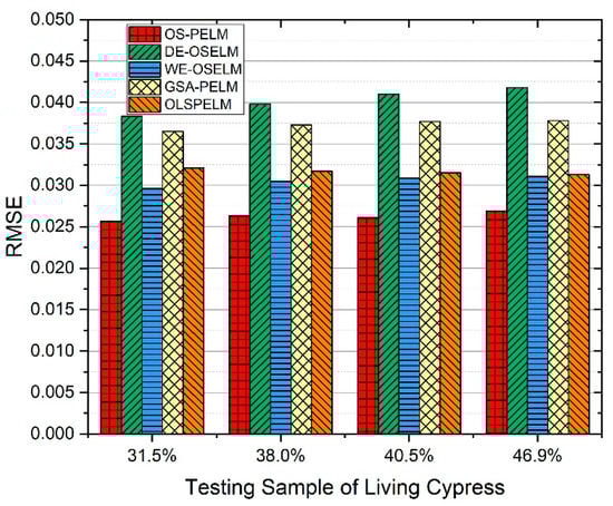 We adopted the dataset of standing cypress with four MC levels, with the reader antenna placed 0.4 m away from the trunk. As the results show, the RMSE of our proposed model is consistently lower than 0.0275, being at least one order of magnitude more accurate than other models. Additionally, the histogram value is smooth and steady, and does not change observably with the MC status. Therefore, the generalization ability and prediction accuracy of the OS-PELM model are much better than those of the other four models.
