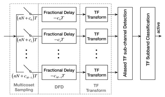In summary, the flow of the AdNoR algorithm is shown in Figure 1. First, a folded TF spectrum model is established. This step is implemented by three functional modules: multicoset sampling, DFD, and TF transform. This section will be covered in detail in Section 2. Next is the algorithm design part. Based on the folded TF spectrum model, we select the active aliased TF sub-channel who contains active signal with the help of module “Aliased TF Sub-channel Detection”. Then, we identify the exact location of active TF subband in the active aliased TF sub-channel by module “TF Subband Classification”. This part will be described in detail in Section 3. Simulation results are presented and analyzed in Section 4. We finally make the conclusion in Section 5.