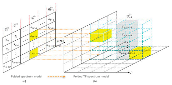 Figure 2b is the virtual model display of (13), i.e., the folded time-frequency spectrum model. Furthermore, Figure 2a shows the folded frequency spectrum obtained in the article of our proposed NoR algorithm. It is easy to see that the folded TF spectrum is essentially an extension of the folded frequency spectrum in the time domain.
