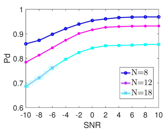 (2) Sensing Performance versus Down-sampling Factor N: In the second experiment, we set , , , , and . In this experiment, we discuss the effect of N on the performance of AdNoR. In Figure 4, we can see that the AdNoR algorithm is significantly affected by N, and its performance is decreasing as N increases. The reason is as follows: N, the down-sampling factor, is also the spectrum folding factor (or degree), and it is easy to understand that as the folding degree increases, the probability of the ADFS structure being satisfied decreases [], which will directly affect the accuracy of subband classification.