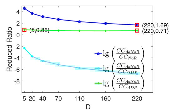 Reduced Ratio of computational complexity of AdNoR against NoR, OMP, and ADP, respectively, with parameters consistent with the first experiment.