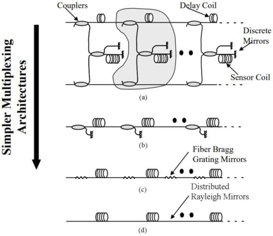 The development history of the structure of the FOH: (a) Conventional TDM, FDM architectures; (b) Inline Michelson; (c) Low Finesse Fabre-Perot; (d) Distributed fiber optic hydrophone.