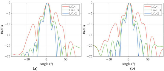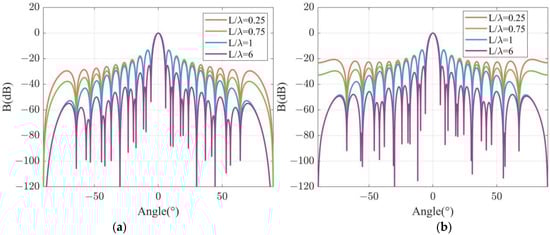 Simulated beam patterns for different channel lengths at specific channel spacing: (a) ; (b) .
