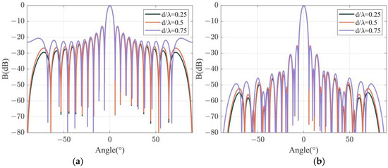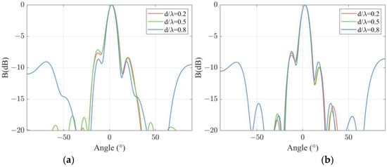 The effect of channel spacing on the directivity function of a DFOH is also experimentally studied. The array length is set at 8 m, and is selected as 1.5. Directivity functions of the DFOH in the case of = 0.2, 0.5, and 0.8 are calculated and are presented in Figure 8a. The results in the figure show that as increases from 0.2 to 0.8, the widths of the main lobe decrease from 11.6° to 10.4°. In addition, the heights of the first-order side lobe decrease from −8.39 dB to −9.04 dB. Both the widths of the main lobes and the height of the first-order side lobes change slightly. The conclusions mentioned above are also valid in the cases of , which are confirmed by the calculated results shown in Figure 8b.
