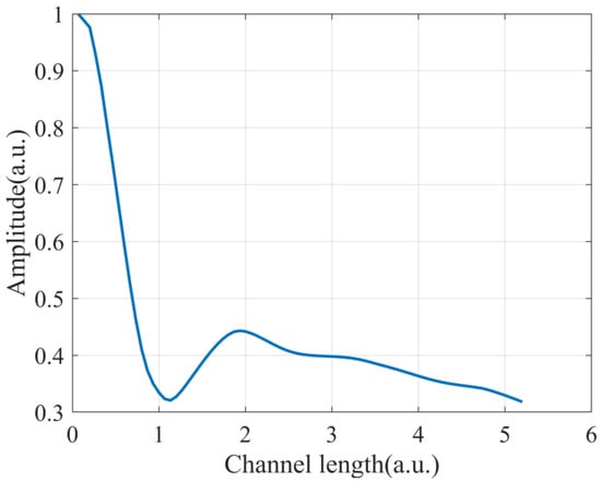Firstly, directivity dependence of a sensing channel on channel length is experimentally verified. The output of a sensing channel is a time-varying phase oscillating at 1000 Hz, and the amplitude of is linearly proportional to directivity function B1 for a certain , θ, and λ. During signal processing, channel length is changed, and the amplitude of as a function of is presented in Figure 5. The amplitude for each channel length in Figure 5 is the average value of phase amplitudes of ten contiguous channels spaced by m. The results show that the phase amplitude varies with in the way of a sinc function. Since the amplitude of is linearly proportional to B1, the results in Figure 5 confirm B1 as a sinc function of , which is consistent with Equation (4).
