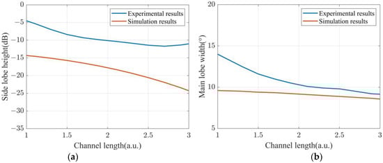 Experimental and simulation results of (a) side lobe height and (b) main lobe width as a function of channel length.