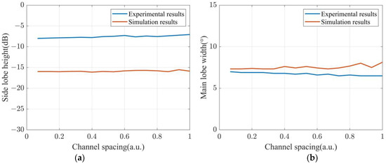 The dependence of directivity function B on the sensing spacing is specifically verified. The is set from 0 to 1 in the step of 0.02. The is selected as 2. The first-order side lobe height and main lobe width are calculated using the experimental results and are presented in Figure 9. The calculated first-order side lobe height presented in Figure 9a is stable at about −8 dB, and its maximum value is only 0.94 dB higher than the minimum value. Figure 9b presents the calculated main lobe width. The main lobe width is stable at around 7°, and the gap between its maximum value and minimum value is 0.5°. Also presented in Figure 9 are the simulation results of fist-order side lobe height and main lobe width. The simulation results show the same stable trend as the experimental results. However, the noise in the experiment causes different specific values between the simulation results and the experimental results.