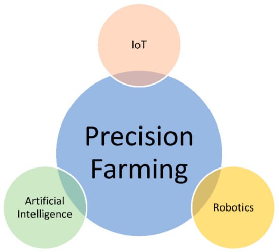 Precision farming, otherwise known as the precision agriculture, is the next big revolution in agriculture. It aims to bring real-time information on farms and livestock to the farmers as required, allowing them to make precise and timely decisions, resulting in higher harvest and less wastage of scarce resources [,,,,]. Predominantly, precision farming is a collation of three main technologies: Artificial Intelligence (AI), agriculture robotics, and Internet of Things (IoTs) [], as depicted in Figure 1.