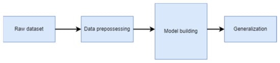 Normally the process of ML can be broken down into three parts: data loading and preprocessing, model building, and generalization, as shown in Figure 3. The data are loaded in the form of a raw dataset; secondly, the data are preprocessed; and thirdly, the predictive ML model is built using suitable ML algorithms. Finally, the generalization involves predicting the output for inputs on which the ML algorithms have never trained before.