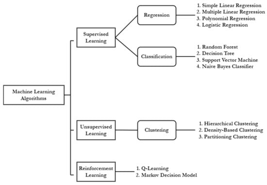 As of now, owing to the availability of powerful innovative algorithms, big data, and fast Internet connections, ML applications have been widely used for solving a variety of problems that humans often fail or need a lot of time to solve. On the other hand, DL, which is a branch of ML, trained on much larger datasets or with higher volumes of big data, can also be used to make intelligent decisions, the same as ML. ML can be further broken down into three categories: supervised learning, unsupervised learning, and reinforcement learning [,,,,,,,,,,], as depicted in Figure 4.