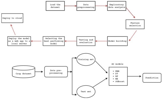 The first step involved in the design of our crop recommendation platform includes preparing our crop recommendation dataset, which we took from Kaggle [], and was built by augmenting actual rainfall, climate, and fertilizer data available for India [], and secondly preprocessing the data for further analysis. Altogether, the dataset we employed contained 2200 records and eight features. In the third step, we performed an exploratory data analysis using the underlying data in the dataset, in order to understand the nature of our data. The fourth step involved extracting the best features in order to build our ML models using different classification ML algorithms including KNN, DT, RF, XGBoost, and SVM algorithms. Once the model-building step was completed in the next step, we evaluated the performance metrics of the models, and once the evaluation was complete, we arranged the deployment of our best-performing model as a cloud-based web app on the Google Cloud platform, making up our crop recommendation platform. To achieve a better understanding, all steps involved in the design of our crop recommendation platform, along with the high-level architecture of our proposed platform, are illustrated in Figure 5.