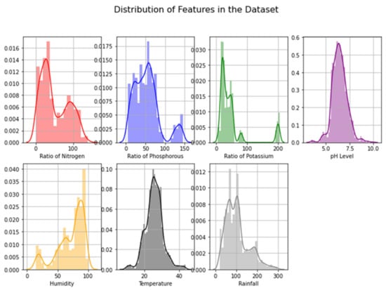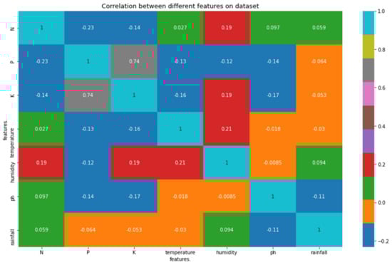 The features in the chosen crop recommendation dataset [,] included soil nitrogen level (N), soil phosphorus level (P), soil potassium level (K), air temperature, air humidity, soil pH level, rainfall, and crop label, which is a categorical variable (i.e., the type of crop). The dataset contained 2200 records, and Table 3 depicts the statistical summary of our dataset for better understanding. Further, in order to understand the true nature of our data before dealing with predictive data analysis, we performed an exploratory data analysis. In this regard, in order to understand what kind of data we were dealing with (range and distribution), we analyzed the distribution of features as depicted in Figure 6. Next, we plotted a correlation heatmap depicting the correlation matrix representing the correlation between different features on the dataset, as shown in Figure 7. According to the correlation heatmap, it is evident that there is only a strong positive correlation (correlation score close to 1) between a few of the features, with most of the features having a very weak correlation or being negatively correlated (correlation score close to 0 or less than 0).