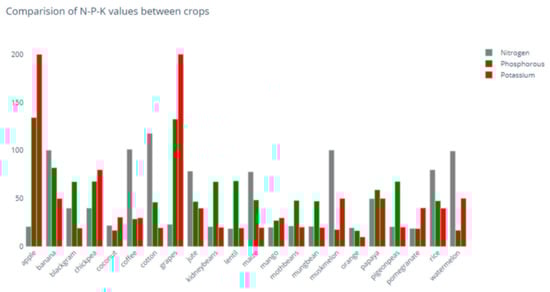 These macro-nutrients can be supplied through fertilizer, and depending on the N, P, and K concentrations of the fertilizer, it will be better suited to different ranges of crops. Furthermore, crops require large amounts of N, P, and K to grow and thrive, and plants that are well fed are healthier and more productive. However, if farmers do not use fertilizer, the soil may not provide enough nutrients for maximum growth []. Fertilizer adds nutrients that the soil lacks, and understanding the NPK ratios that crops require would thus assist farmers in achieving optimal plant development and yield by managing fertilization. Hence, in this regard, and as depicted in Figure 8, we evaluated the N, P, and K requirements for different types of crops in our dataset. Based on Figure 8, it is evident that apples and grapes require a high potassium level compared to all other crops, based on our data in the dataset.