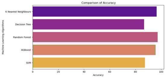 In this section, the experimental results are discussed regarding the predicting performance of ML algorithms we adopted. Table 4 demonstrates the accuracy, precision, recall, F1, and 10-fold cross-validation scores we obtained for better comparison. Further, Figure 9 demonstrates the accuracy comparison of all ML models we have adopted.