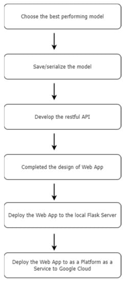 Based on the performance evaluation criteria outlined above, it is evident that RF performs best among the ML algorithms adopted, in terms of predicting which crop to harvest. Hence, for our crop recommendation platform, we intend to use RF to predict the most suitable crop, according to the input parameters submitted by the user, which include N, P, K, air temperature, air humidity, soil pH level and rainfall. Once the best-performing model has been selected, the model is separately serialized/saved for the design of the crop recommendation platform using the Python pickle module as the next step. All steps involved in the design and deployment of the crop recommendation platform are depicted in Figure 10.