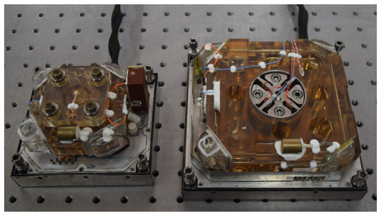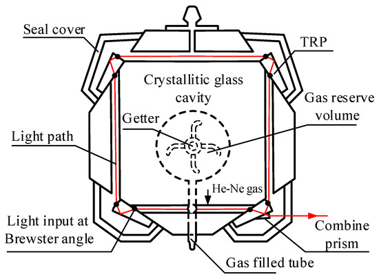 The prism ring laser consists of four total reflection prisms (TRPs) that constitute the ring light path. The He-Ne mixed gas is sealed in a capillary tube by the two TRPs, shown toward the bottom in Figure 1. A gas reserve volume is connected to the capillary tube filled with He-Ne gas. In the sagittal plane, at an angle to the meridian surface, a gas-filled tube is sealed, retained for changing the gain medium. According to the aeration process, in order to ensure the purity of the He-Ne gain medium, there is a first inflation, a burn-in process, a vacuum exhaust, and a second inflation that moves through to the ring cavity. The gas component and the isotope ratio of the Ne remain the same in the two inflation processes. After the first inflation, there is a week of a continuous burn-in process for the prism ring laser. Through this burn-in, the impurities in the capillary tube can be thoroughly removed. Next, the He-Ne gas in the capillary tube is removed, and the vacuum treatment is performed. Finally, the capillary tube is filled with the pure mixture of He-Ne gas again. The purpose of the double inflation is to eliminate the impure gas particles, which may be wrapped in the molecular structure of the cavity. The impure gas particles can cause the ring laser to fail due to the purity drop in the Ne-Ne gas in the long term. In addition, the getter with a support plate is placed in the gas reserve volume to absorb the gas impurities that are released from the cavity during long-term operation.